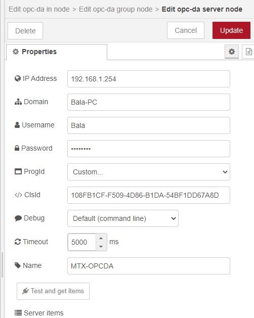 I ran a simple PLC program on my MTX system (an output turning ON/OFF every few milliseconds). The OPC server details from the MTX were configured in the OPC DA node in Node Red (see pic OPC-DA-1.jpg). The corresponding PLC variable is configured in OPC DA as shown in pic (OPC-DA-2.jpg). The flow was setup in Node Red as shown in pic OPC-DA-3.jpg. As can be seen in pic OPC-DA-output.jpg, I was able to successfully get the variables from MTX into Node-Red using the configured OPC-DA node.Â