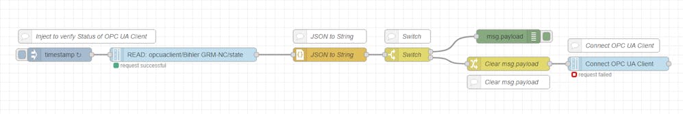 please find enclosed the flow I am currently using. First I used the Ctrlx subscription node to trigger the state. Meanwhile we have switched to an inject node with an initial start + interval. This prevents if machine is switched off that there will be no reconnect after powering on the machine. Currently we are using 15 seconds. You only have to change the READ node to your own OPC UA client state.