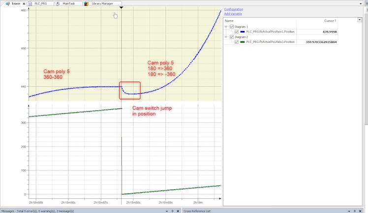 When the profile switch from cam 0 to cam 1 there is a jump with a 2 mm negative positioning