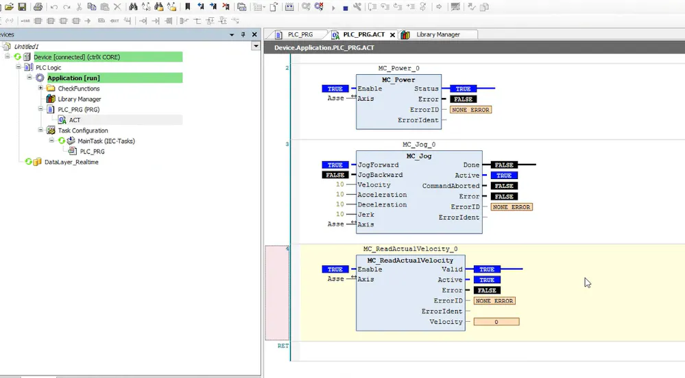 -> The PLC open FB MC_ReadActualVelocity don't gives you any velocity data from the real drive (virtual it is working)