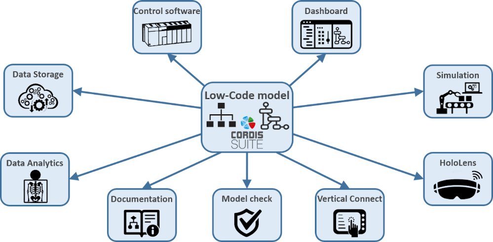 In addition to the low-code development of software for controlling hardware, the Cordis SUITE platform also provides other digitization aspects such as collecting, storing and visualizing all operational and sensor data; linking with simulations; linking with User Interface applications; linking with Microsoft HoloLens applications; generating design documentation in PDF, Word or HTML.