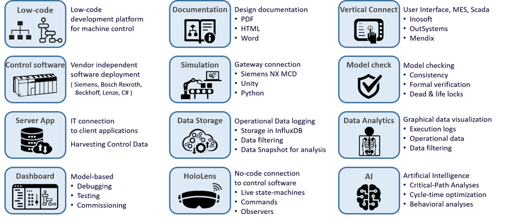 In addition to transforming (or generating) the machine control software, the low-code model is also used for integrating User Interface applications, Microsoft HoloLens applications, Simulation applications, Data analysis applications, Documentation and Formal verification model checkers.