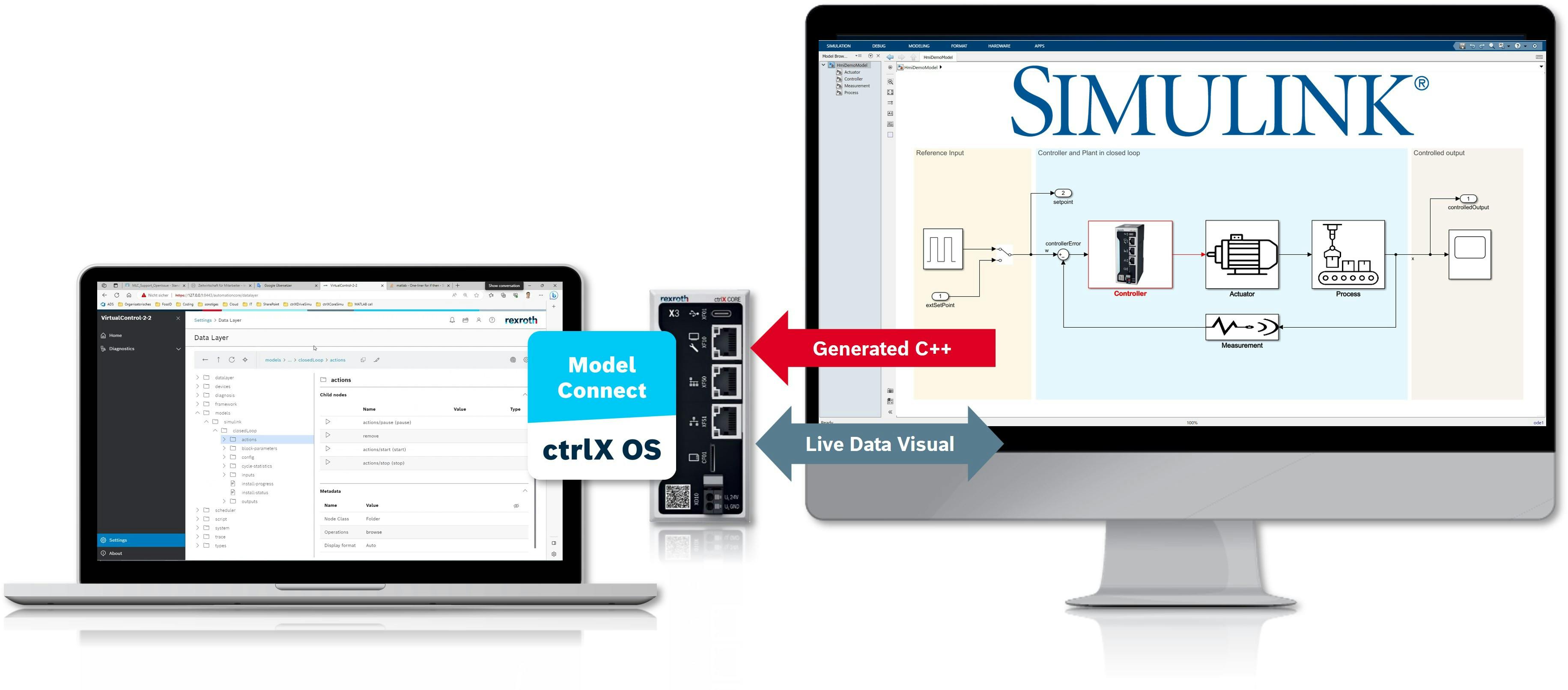 The Model Connect App serves as a mediator for the connection of ctrlX OS devices to powerful market toolchains for Model-Based Software Development (MBSD). Through the use of the ctrlX Data Layer these toolchains benefit directly from data feeds written by other ctrlX OS apps, e.g. connecting fieldbus participants. With this architecture even use cases beyond MBSD, such as simulation, virtual commissioning and live condition monitoring are approachable - all with the powers of the connected tools.