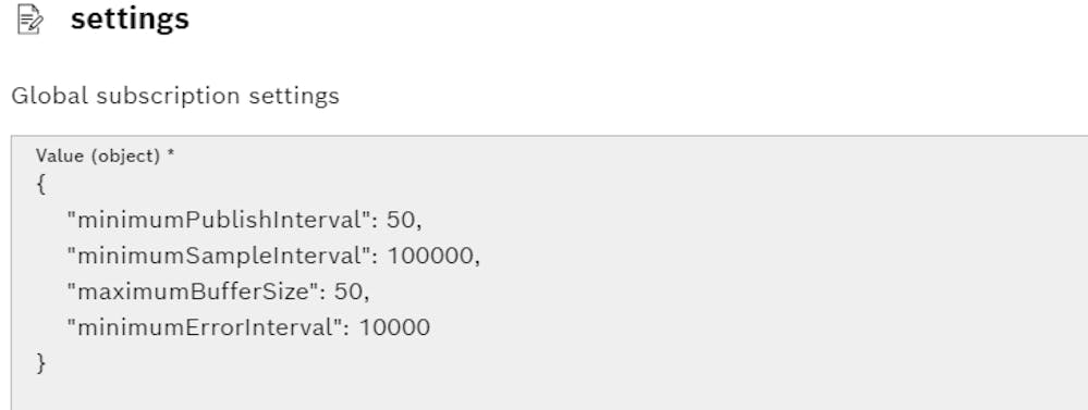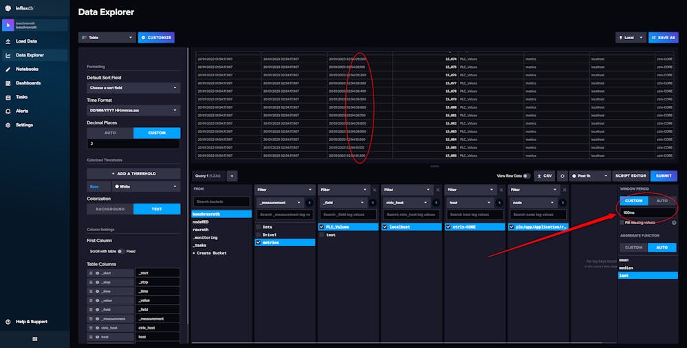I am trying to send values every 100ms to InfluxDB. For that, I am using Telegraf and there I have configured a 100ms publishinterval and a 100ms samplinginterval. Data is generated with a PLC program every 100ms. Unfortunately, when I try to read the values in the Data explorer in Telegraf there are only values every 1s. I have checked the global subscription settings and it is configured with the minimum default 100000 μs setting and 100ms PublishInterval. I have also tried to send data every 200ms just to make sure that it is not a limit problem, but it continues to update every 1s.