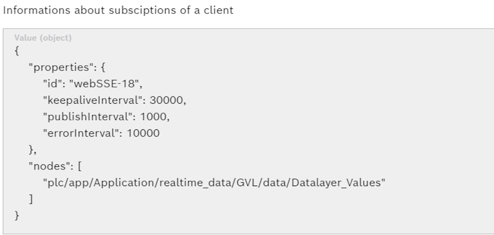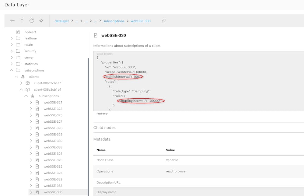 I have the feeling that because Telegraf is reading the values from the Datalayer and the Datalayer updates every 1s, it is not able to read the values that are between. I have checked the ctrlX CORE documentation and there I do not find how to change the subscription properties and I only find that it is possible to change Global settings. Furthermore, when I check the subscription node of the variable I want to read, I see that the configuration is "publishInterval: 1000", but as it is a "read-only" property I can not change it.