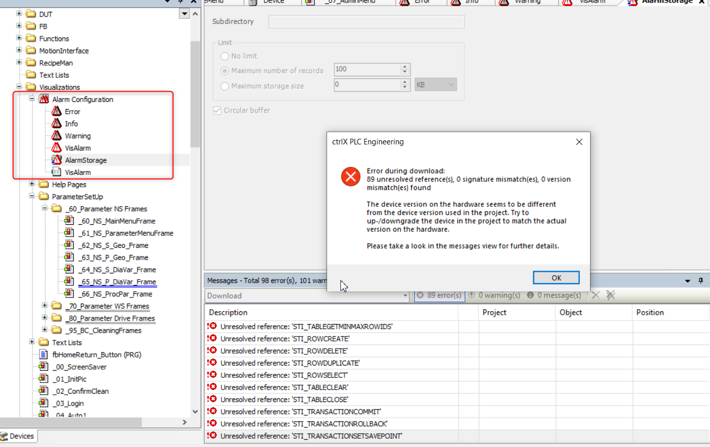 We are having unresolved reference error when try to use the alarm in Indralogic. This works fine while in simulation, but the unresolved error shows up when downloading to the Core. Indralogic and app 1.12.2