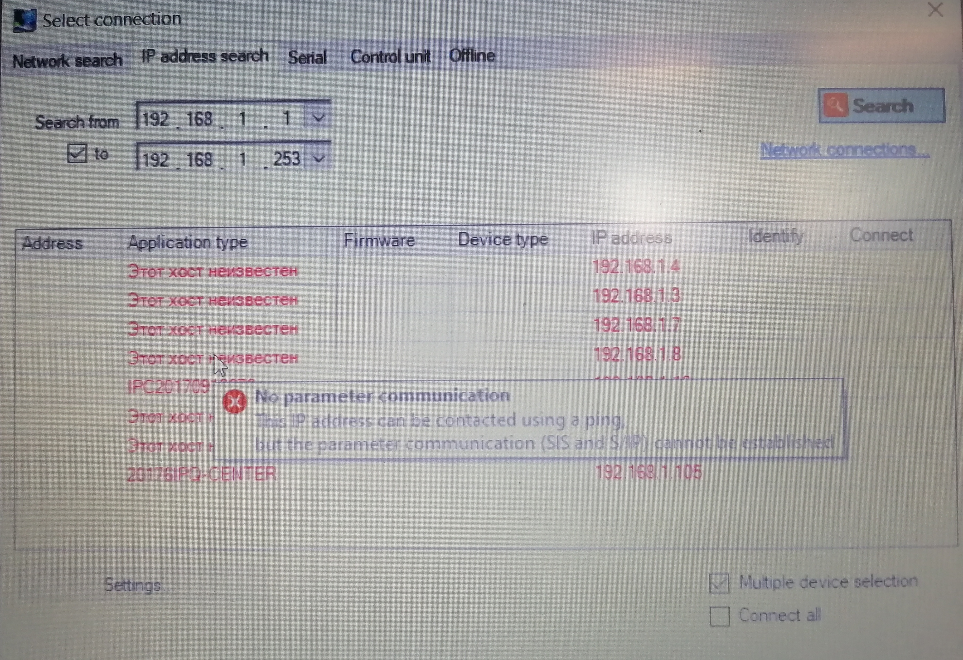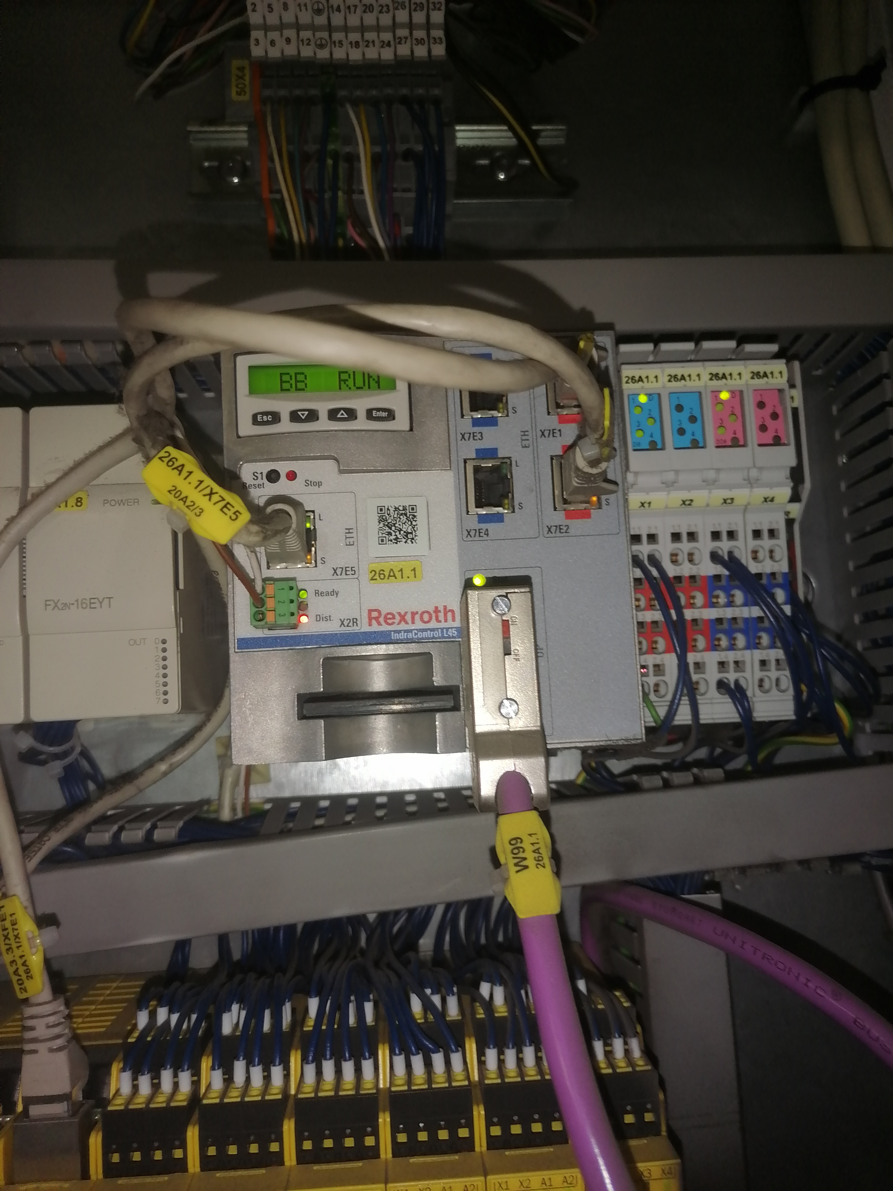 There is a need to connect to the IndraDrive M drive (CDB02.1B-ET-EC-EC-EM-S4-S4-NN-NN-FW) via Ethernet, for this we use IndraWorks 15V20.0, the Ethernet cable is inserted into the HUB of the machine (diagram in the attachment), which is connected to the IndraControl L45. When trying to search for the device by IP (according to the machine diagram, the Bosh IP address is 192.168.1.8), we encounter an error: No parameter communication (parameter SIS and S/IP cannot be established).