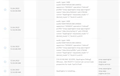 2022-04-13T08:28:46Z ctrlx-CORE /snap/rexroth-deviceadmin/970/bin/wasp[1575] 2022-04-13 08:28:46.720586 +0000 UTC Stopped Service for snap application appengine-snap.app-engine. 2022-04-13T08:28:46Z ctrlx-CORE /snap/rexroth-deviceadmin/970/bin/wasp[1575] 2022-04-13 08:28:46.730191 +0000 UTC Started Service for snap application appengine-snap.app-engine. 2022-04-13T08:28:46Z ctrlx-CORE /snap/rexroth-deviceadmin/970/bin/wasp[1575] 2022-04-13 08:28:46.86705 +0000 UTC We are here: /snap/appengine-snap/x1/ 2022-04-13T08:28:46Z ctrlx-CORE /snap/rexroth-deviceadmin/970/bin/wasp[1575] 2022-04-13 08:28:46.86705 +0000 UTC Set capabilities for SICK AppEngine binary and make it executable 2022-04-13T08:28:46Z ctrlx-CORE /snap/rexroth-deviceadmin/970/bin/wasp[1575] 2022-04-13 08:28:46.871206 +0000 UTC AVC apparmor="DENIED" operation="exec" profile="snap.appengine-snap.app-engine" name="/usr/sbin/setcap" pid=686877 comm="run.sh" requested_mask="x" denied_mask="x" fsuid=0 ouid=0 2022-04-13T08:28:46Z ctrlx-CORE /snap/rexroth-deviceadmin/970/bin/wasp[1575] 2022-04-13 08:28:46.872251 +0000 UTC AVC apparmor="DENIED" operation="exec" profile="snap.appengine-snap.app-engine" name="/usr/sbin/setcap" pid=686877 comm="run.sh" requested_mask="x" denied_mask="x" fsuid=0 ouid=0 2022-04-13T08:28:47Z ctrlx-CORE /snap/rexroth-deviceadmin/970/bin/wasp[1575] 2022-04-13 08:28:46.873628 +0000 UTC /snap/appengine-snap/x1/run.sh: 5: setcap: Permission denied 2022-04-13T08:28:47Z ctrlx-CORE /snap/rexroth-deviceadmin/970/bin/wasp[1575] 2022-04-13 08:28:46.879704 +0000 UTC chmod: changing permissions of '/snap/appengine-snap/x1/AppEngine': Read-only file system 2022-04-13T08:28:47Z ctrlx-CORE /snap/rexroth-deviceadmin/970/bin/wasp[1575] 2022-04-13 08:28:46.880742 +0000 UTC Run AppEngine 2022-04-13T08:28:47Z ctrlx-CORE /snap/rexroth-deviceadmin/970/bin/wasp[1575] 2022-04-13 08:28:46.88111 +0000 UTC audit: type=1400 audit(1649838526.860:286268): apparmor="DENIED" operation="exec" profile="snap.appengine-snap.app-engine" name="/usr/sbin/setcap" pid=686877 comm="run.sh" requested_mask="x" denied_mask="x" fsuid=0 ouid=0 2022-04-13T08:28:47Z ctrlx-CORE /snap/rexroth-deviceadmin/970/bin/wasp[1575] 2022-04-13 08:28:46.881247 +0000 UTC audit: type=1400 audit(1649838526.870:286269): apparmor="DENIED" operation="exec" profile="snap.appengine-snap.app-engine" name="/usr/sbin/setcap" pid=686877 comm="run.sh" requested_mask="x" denied_mask="x" fsuid=0 ouid=0 2022-04-13T08:28:47Z ctrlx-CORE /snap/rexroth-deviceadmin/970/bin/wasp[1575] 2022-04-13 08:28:46.999269 +0000 UTC ___ _ ___ _ __ 2022-04-13T08:28:47Z ctrlx-CORE /snap/rexroth-deviceadmin/970/bin/wasp[1575] 2022-04-13 08:28:46.999269 +0000 UTC / __|| |/ __| |/ / SICK AppEngine 1.3.1.24 2022-04-13T08:28:47Z ctrlx-CORE /snap/rexroth-deviceadmin/970/bin/wasp[1575] 2022-04-13 08:28:46.999269 +0000 UTC \__ \| | (__| ' < Copyright (C) 2021 SICK AG 2022-04-13T08:28:47Z ctrlx-CORE /snap/rexroth-deviceadmin/970/bin/wasp[1575] 2022-04-13 08:28:46.999269 +0000 UTC |___/|_|\___|_|\_\ 2022-04-13T08:28:47Z ctrlx-CORE /snap/rexroth-deviceadmin/970/bin/wasp[1575] 2022-04-13 08:28:46.999269 +0000 UTC A P P E N G I N E 2022-04-13T08:28:47Z ctrlx-CORE /snap/rexroth-deviceadmin/970/bin/wasp[1575] 2022-04-13 08:28:47.013103 +0000 UTC AVC apparmor="DENIED" operation="mknod" profile="snap.appengine-snap.app-engine" name="/dev/shm/zKXWCM" pid=686879 comm="AppEngine" requested_mask="c" denied_mask="c" fsuid=0 ouid=0 2022-04-13T08:28:47Z ctrlx-CORE /snap/rexroth-deviceadmin/970/bin/wasp[1575] 2022-04-13 08:28:47.013534 +0000 UTC AVC apparmor="DENIED" operation="mknod" profile="snap.appengine-snap.app-engine" name="/dev/shm/T3ZhRL" pid=686879 comm="AppEngine" requested_mask="c" denied_mask="c" fsuid=0 ouid=0 2022-04-13T08:28:47Z ctrlx-CORE /snap/rexroth-deviceadmin/970/bin/wasp[1575] 2022-04-13 08:28:47.013753 +0000 UTC AVC apparmor="DENIED" operation="mknod" profile="snap.appengine-snap.app-engine" name="/dev/shm/yHc9vM" pid=686879 comm="AppEngine" requested_mask="c" denied_mask="c" fsuid=0 ouid=0 2022-04-13T08:28:47Z ctrlx-CORE /snap/rexroth-deviceadmin/970/bin/wasp[1575] 2022-04-13 08:28:47.013992 +0000 UTC AVC apparmor="DENIED" operation="mknod" profile="snap.appengine-snap.app-engine" name="/dev/shm/zAo0zN" pid=686879 comm="AppEngine" requested_mask="c" denied_mask="c" fsuid=0 ouid=0 2022-04-13T08:28:47Z ctrlx-CORE /snap/rexroth-deviceadmin/970/bin/wasp[1575] 2022-04-13 08:28:47.014204 +0000 UTC AVC apparmor="DENIED" operation="mknod" profile="snap.appengine-snap.app-engine" name="/dev/shm/hr9TIK" pid=686879 comm="AppEngine" requested_mask="c" denied_mask="c" fsuid=0 ouid=0 2022-04-13T08:28:47Z ctrlx-CORE /snap/rexroth-deviceadmin/970/bin/wasp[1575] 2022-04-13 08:28:47.014415 +0000 UTC AVC apparmor="DENIED" operation="mknod" profile="snap.appengine-snap.app-engine" name="/dev/shm/60zBQM" pid=686879 comm="AppEngine" requested_mask="c" denied_mask="c" fsuid=0 ouid=0 2022-04-13T08:28:47Z ctrlx-CORE /snap/rexroth-deviceadmin/970/bin/wasp[1575] 2022-04-13 08:28:47.014629 +0000 UTC AVC apparmor="DENIED" operation="mknod" profile="snap.appengine-snap.app-engine" name="/dev/shm/PX6YRK" pid=686879 comm="AppEngine" requested_mask="c" denied_mask="c" fsuid=0 ouid=0 2022-04-13T08:28:47Z ctrlx-CORE /snap/rexroth-deviceadmin/970/bin/wasp[1575] 2022-04-13 08:28:47.014824 +0000 UTC AVC apparmor="DENIED" operation="mknod" profile="snap.appengine-snap.app-engine" name="/dev/shm/Nuz1hN" pid=686879 comm="AppEngine" requested_mask="c" denied_mask="c" fsuid=0 ouid=0 2022-04-13T08:28:47Z ctrlx-CORE /snap/rexroth-deviceadmin/970/bin/wasp[1575] 2022-04-13 08:28:47.015042 +0000 UTC AVC apparmor="DENIED" operation="mknod" profile="snap.appengine-snap.app-engine" name="/dev/shm/yPSKJJ" pid=686879 comm="AppEngine" requested_mask="c" denied_mask="c" fsuid=0 ouid=0
