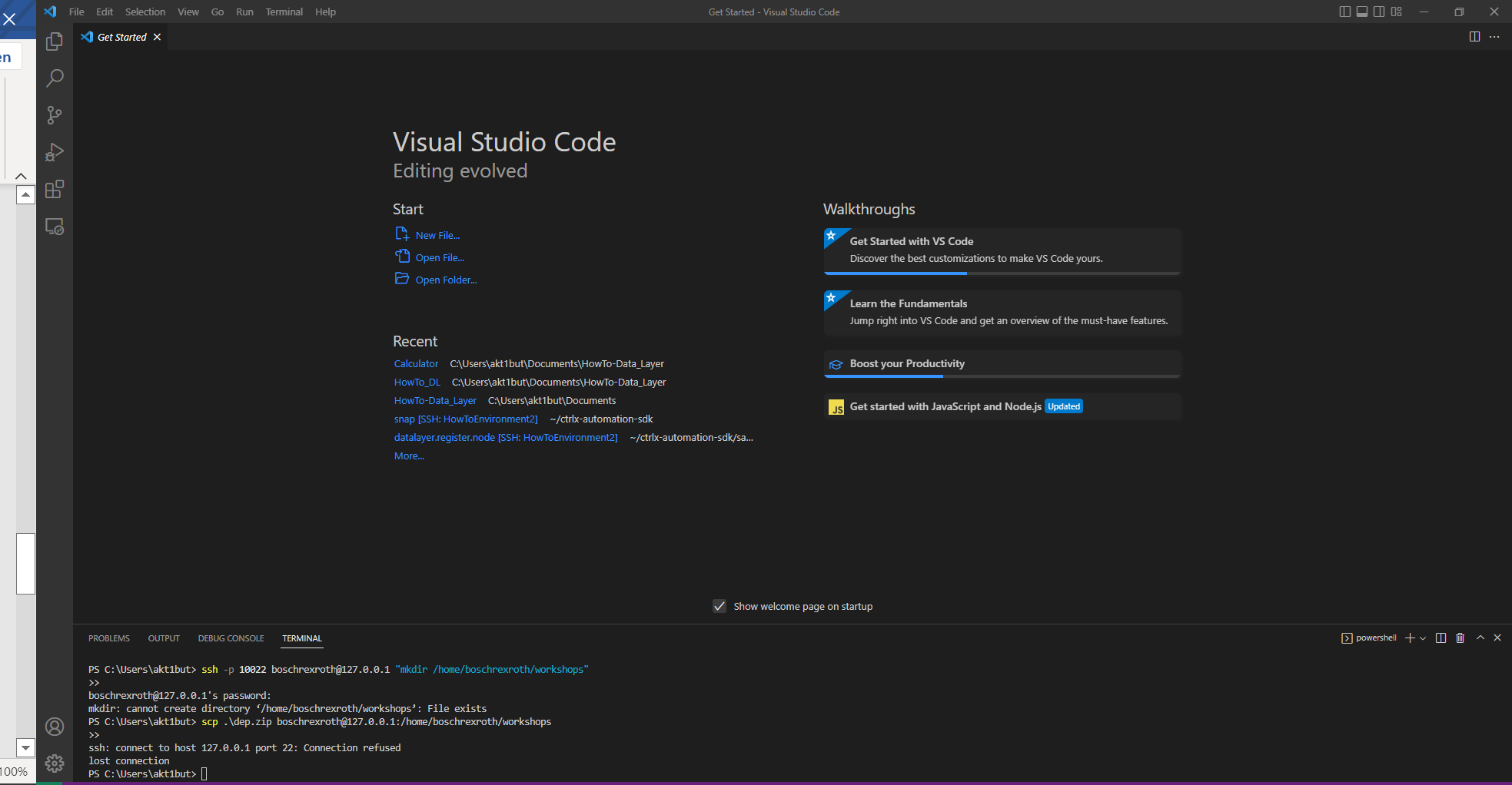 The problem is, I want to transfer my "HowToDataLayer" Folder from my home PC, which is located inΒ C:\Users\akt1but\Documents\HowTo-Data_Layer to the SSH App building environment (with the commands provided in the Prerequisities HowTo_DL), but I get a connection refused message everytime (Attached). px.exe is running.