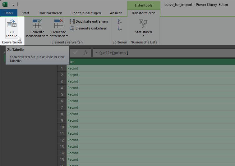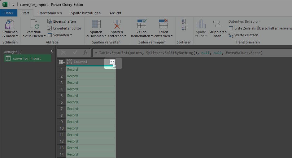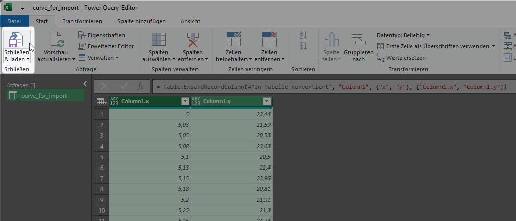 The curve points are extracted and visible. Copy to your Excel sheet with "Close & Load" ("Schließen & laden")