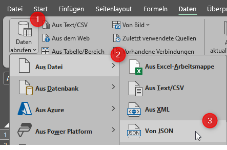 Navigate to "get Data" ("Daten abrufen"), then select "From File" ("Aus Datei") and "From JSON" ("Von JSON").