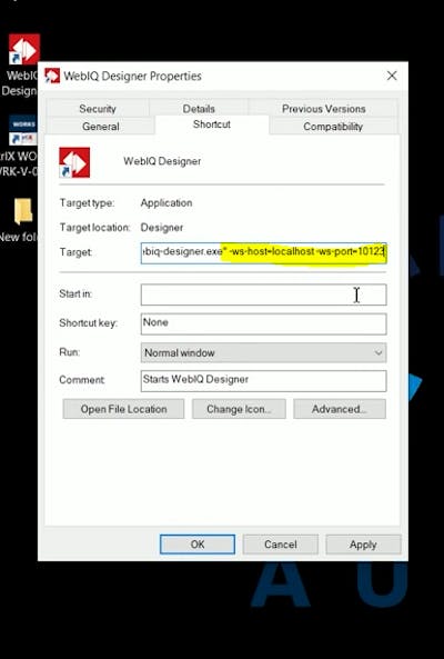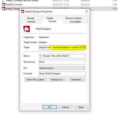 the settings shown in the video (--ws-host=localhost--ws-port=10123 ) have no effect at all as they just set the defaults that are valid anyway - by default WebIQ Designer connects to localhost on port 10123 so you can safely ignore this and do not have to set it.