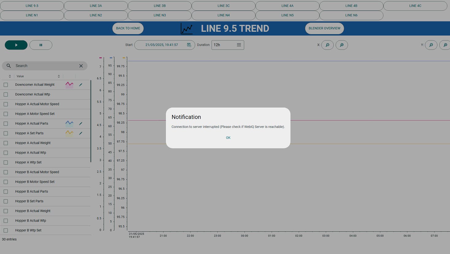 When I leave the HMI solution open in the browser overnight, I get a notification popup stating "Connection to server interrupted (Please check if WebIQ Server is reachable)". If I click the "OK" button on the prompt, I can log in to the HMI application again using my credentials (which shows that the server is still reachable from the browser).